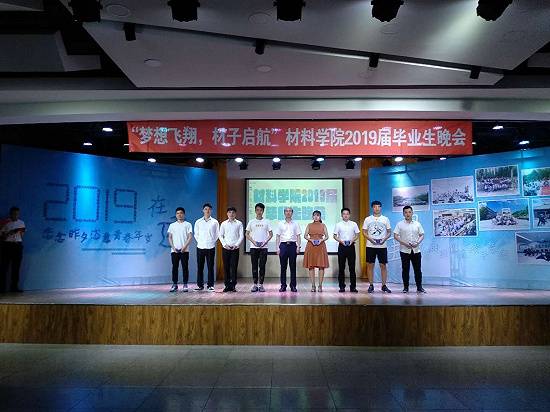 毕业晚会星光璀璨,材料学子扬帆起航。6月20日晚,材料学院2019届毕业生欢聚一堂,参加在大学生活动中心举办的“梦想飞翔,材子启航”毕业晚会。晚会以丰富多彩的表演串联成大学四年的记忆,让毕业生在感动中为自己的大学生活画上圆满的句号。同时,材料学院为毕业生准备了特殊的“毕业戒指”作为毕业礼物,愿材料学院和毕业生的心紧紧联系在一起,同时2019届材料学子也为学院创作了歌曲<别了,浑南东路9号>作为礼物回赠,表达他们对学校、学院深深的祝愿和感谢。