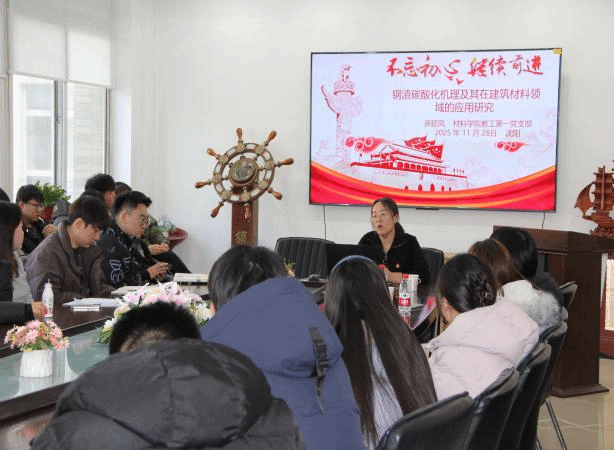本次活动由党支部书记吴丽梅教授策划、组织,支部党员积极参与,材料学院硕士研究生共有50余人参加。活动中支部党员丁向群教授就“学位论文研究中提升综合竞争力的思考”这一话题进行了专题讲座,从研究方法、实验设计以及成果转化等方面深入探讨了学术研究的关键思路与策略;支部党员房延凤副教授围绕“钢渣碳酸化机理及其在建筑材料领域的应用研究”展开,分享了自己的研究成果与实践经验,并与相关专业学生进行了深入讨论。